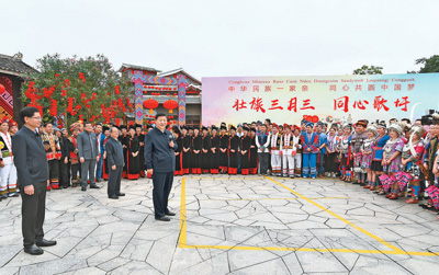 廣西是我國少數民族人口最多的自治區。27日上午,習近平來到位於南寧市邕江之畔的廣西民族博物館,參觀壯族文化展。博物館外,三月三“歌圩節”壯(zhuang)族(zu)對(dui)歌(ge)等(deng)民(min)族(zu)文(wen)化(hua)活(huo)動(dong)正(zheng)在(zai)這(zhe)裏(li)集(ji)中(zhong)展(zhan)示(shi)。習(xi)近(jin)平(ping)強(qiang)調(tiao),廣(guang)西(xi)是(shi)全(quan)國(guo)民(min)族(zu)團(tuan)結(jie)進(jin)步(bu)示(shi)範(fan)區(qu),要(yao)繼(ji)續(xu)發(fa)揮(hui)好(hao)示(shi)範(fan)帶(dai)動(dong)作(zuo)用(yong)。各(ge)民(min)族(zu)共(gong)同(tong)團(tuan)結(jie)進(jin)步(bu)、共同繁榮發展是中華民族的生命所在、力量所在、希望所在,在全麵建設社會主義現代化國家的新征程上,一個民族都不能少,各族人民要心手相牽、團結奮進,共創中華民族的美好未來,共享民族複興的偉大榮光。